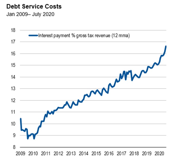 Interest is now absorbing twice the tax revenue of 2010 in percentage terms. This cannot go on.