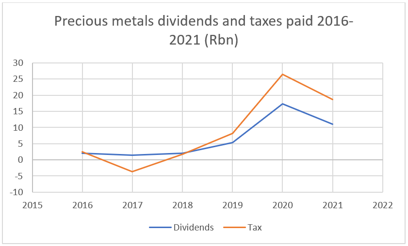 The following chart shows the impact of precious metals producers (mostly platinum) on tax and dividend contributions.