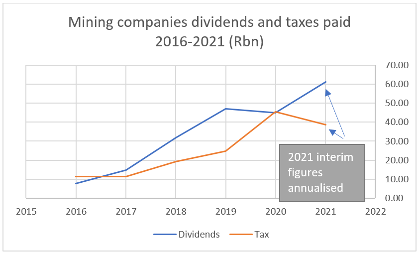 The tax contributions and dividends will certainly end 2021 at much higher levels than displayed in the graph below, as several miners have still to report their financial results. Slowing growth in China may put a crimp in the current commodity boom – at least for a while – though the years of judicious capex and cost control means shareholders and Sars should yet be able to count on a few more good years from the mining sector.