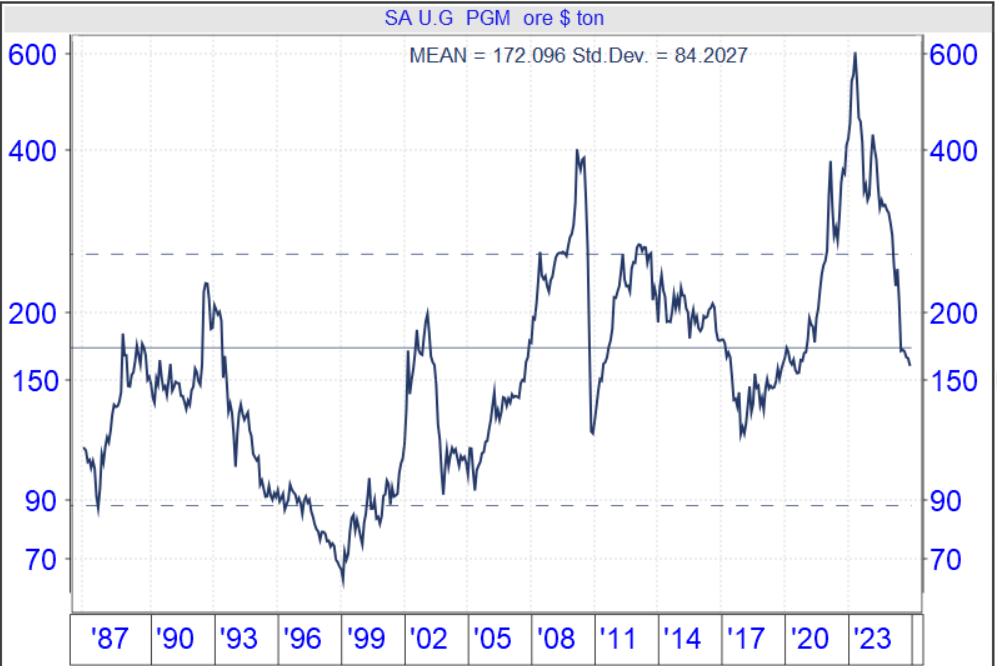 The graph below shows the long-term price of PGMs, which is currently about 35% below its 35-year mean.