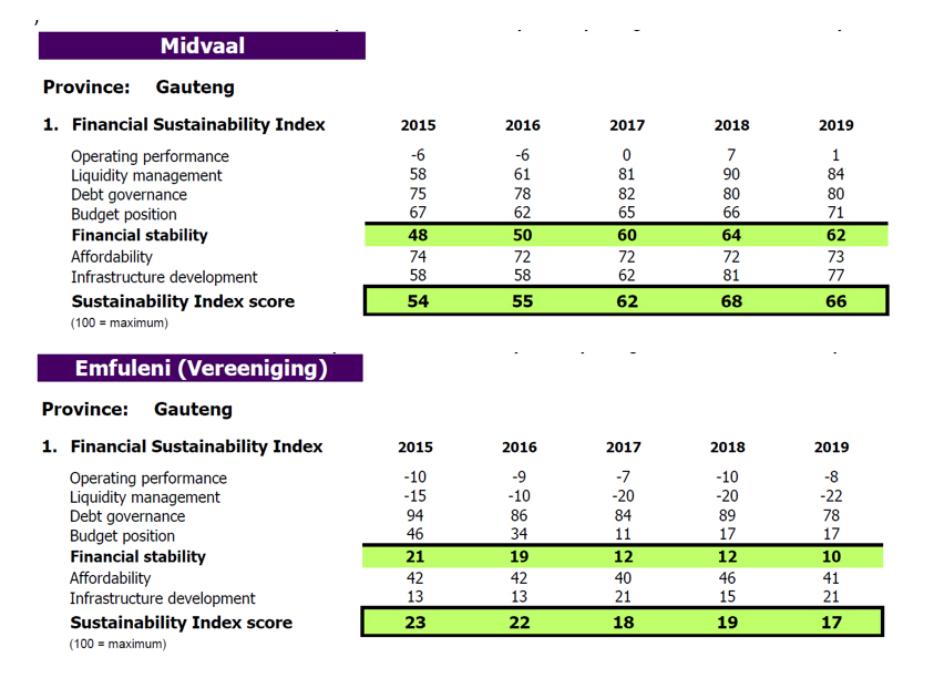 Contrast this with neighbouring Midvaal, a smaller and more prosperous municipality – and one of the best run in the country, according to Ratings Afrika’s Municipal Financial Sustainability Index (MFSI) survey.