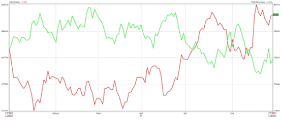 The chart below shows an inverse correlation between the JSE All Share Index (red) and the ZAR-USD exchange rate (green) since the start of 2024.