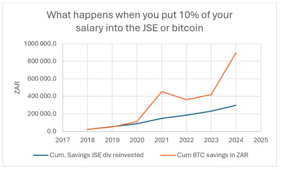To bring the exercise back to South Africa, we made the assumption that 10% of the average salary is saved each month and invested once a year in either the JSE or bitcoin. No allowance is made for tax, which will vary widely depending on circumstances and investment choices (such as tax-free savings accounts), so bear that in mind.