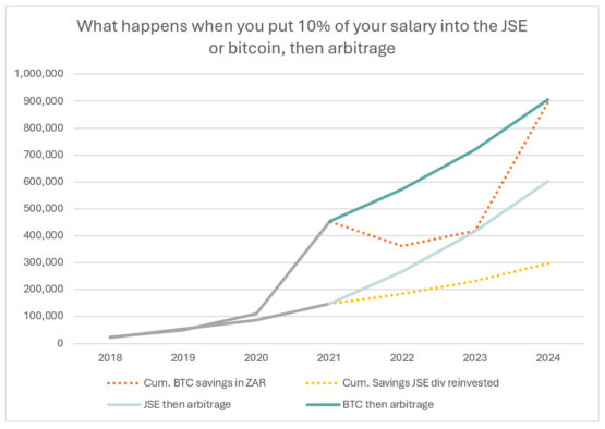The chart above assumes that you accumulate savings in either the JSE or bitcoin until reaching R100 000 and then switch to arbitrage trading.