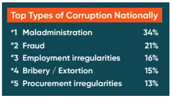 The predominant types of corruption noted by Corruption Watch in 2023 were maladministration, accounting for 34% of reports, followed by fraud (21%), employment irregularities (16%), bribery or extortion (15%) and procurement irregularities (13%).