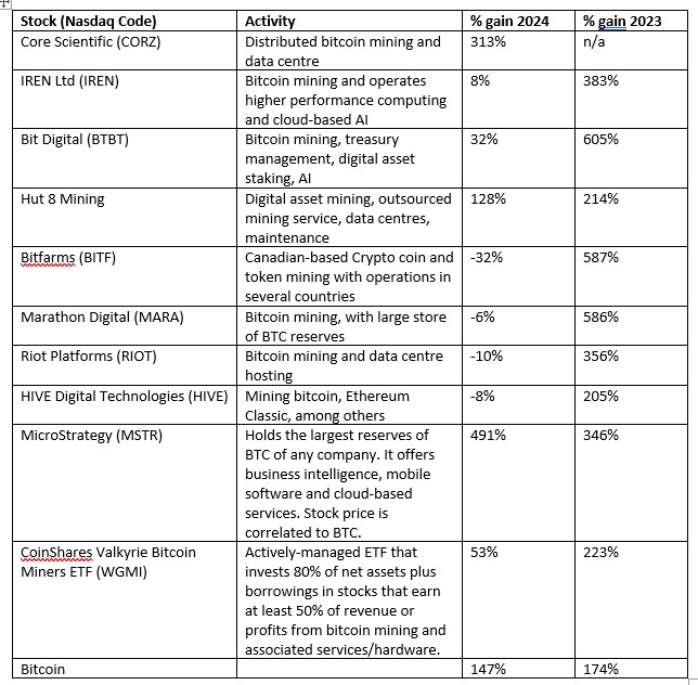 Iris Energy (IREN) had a spectacular 2023 when it delivered a stock price gain of 383% but managed just 8% in 2024. In December last year, it announced a major increase in its mining capacity and mined 529 BTC in that month. Like many others in this space, it is stocking up on Nvidia processors and expanding into high-performance computing and AI.